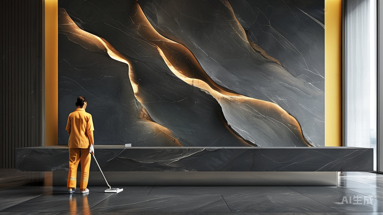 那整面铺陈的岩板,则如深沉而厚重的画布底色,承载了生活所有的奔忙与从容。它材质坚密如磐石,厨房油渍抑或客厅水痕,轻轻一抹便杳无踪迹。它的冷静沉稳并非拒人千里的冰冷,反在无形中撑持起整个空间的筋骨。当窗外雨丝斜织,抑或室内灯光氤氲,岩板表面便悄然映照出流动的光影,石纹肌理便也仿佛微微呼吸起来——这沉稳背景之下,竟悄然流淌着生命之生动韵律。