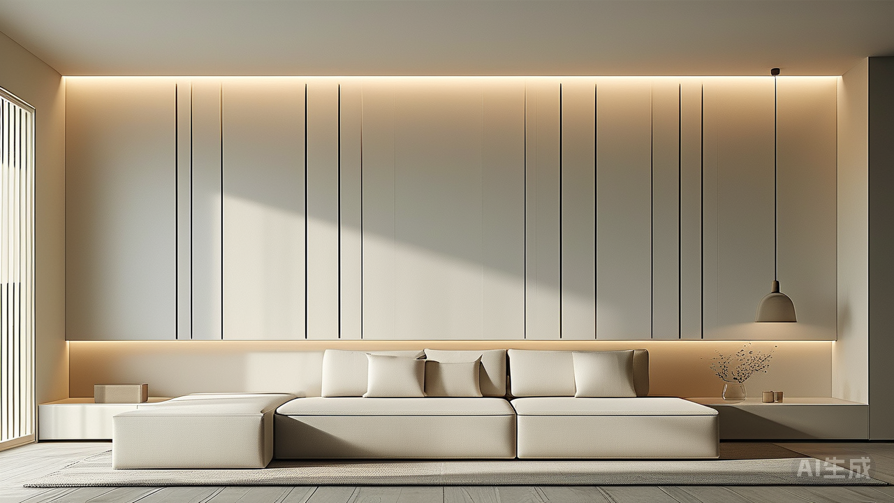极简线条:勾勒空间的骨架之美 真正的空间舒展,源于视觉的纯净与呼吸感。极简线条正是这份轻盈的缔造者。墙面摒弃繁复装饰,仅以利落的垂直水平线分割区域,如隐形框架般支撑起空间结构;顶面嵌入的纤细灯带,如清浅光束引导视线向远处延伸,温柔勾勒出立体轮廓。柜体采用无拉手设计,隐形收纳让杂乱无处遁形;家具选择线条简约的款式,利落轮廓在光影中化作优雅的几何雕塑。线条的克制与精炼,使空间结构清晰明朗,阻隔感尽消,开阔意境自然生成。