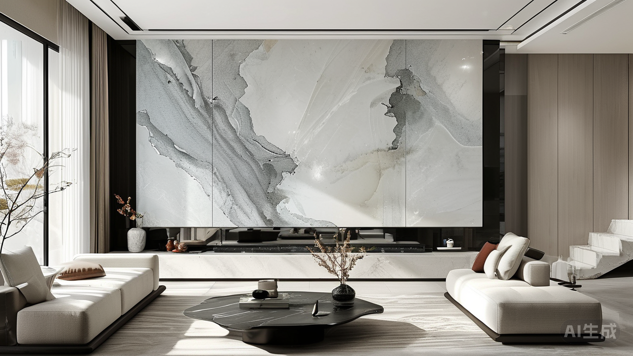墙与地,承载艺术新表达。 岩板不再甘心只做沉默的基底。它正以巨大而连续的整幅画面,成为空间的叙事者与装饰家。那从地面径直攀援而上的岩板,仿若自然山川的片段被切割、定格于室内,其逼真纹理、无隙拼接令房间仿佛拥有了自然的呼吸。客厅背景墙铺开的整幅水墨岩板,不再只是装饰,而是空间气质的奠基者。它以其丰富肌理与耐久的品质,替代了需精心呵护的壁纸或需频繁上漆的涂料,构筑起既稳重又充满艺术张力的空间基调。即便是楼梯踏步,岩板亦能演绎轻盈。12毫米的厚度替代了厚重混凝土,以利落线条勾勒出阶梯的韵律,恍若漂浮在空中的精致艺术品,让空间更显通透、舒展。