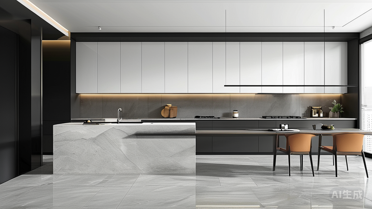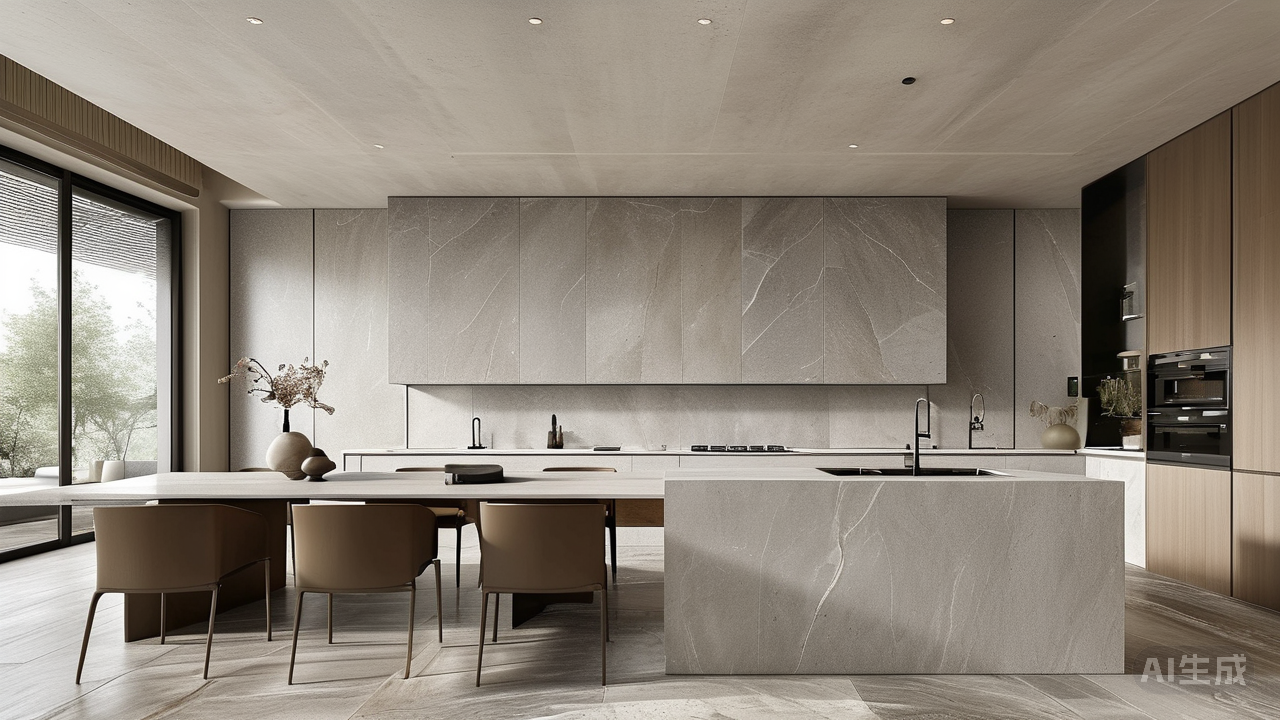 感官一体,触达无界之境。 当指尖滑过岩板表面,冷峻而坚硬的触感传递着现代工业的精准;当光线下它反射出细腻的微光,视觉的连贯被触感的呼应再次确认。岩板以材质内在的语言,为空间创造了完整、统一的感官体验。它消解了传统材质拼接带来的触觉割裂感,使身体在空间中移动时,获得的是连续而沉浸的回应——空间不再是一系列区域的集合,而是真正意义上的整体。