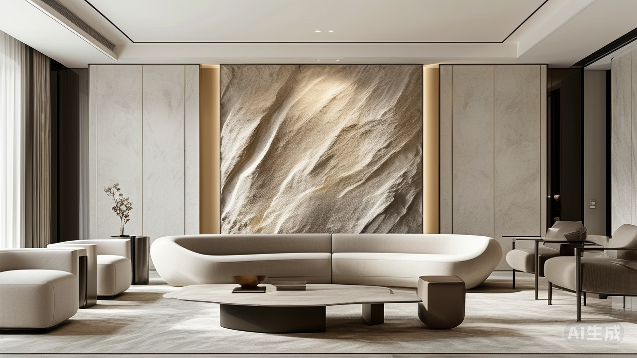轻奢风对自然的亲近与对摩登的追求,在岩板的肌理中得到完美和解。顶级岩板的数码喷墨工艺,赋予其无限逼近珍稀石材、稀有木材乃至抽象艺术的视觉真实感。无论是卡拉拉白静谧的脉络,还是胡桃木深邃的暖意,抑或是火山岩粗犷的肌理,岩板皆能以一片至纯的“画布”精准还原。它摒弃了天然材料的瑕疵与稀缺,却保留了那份源于自然的诗意与高级感,成为空间低调而富有内涵的背景叙事者。 触感革命:感官愉悦的静谧表达 轻奢的魅力在于细节处的微妙体验。岩板表面经现代工艺精雕细琢,可呈现出截然不同的触感语言:如丝绸般柔滑的哑光面,散发着内敛的温润;如镜面般澄澈的亮光面,折射出理性的光泽;还有逼真还原天然石材凹凸纹理的柔触面,带来指尖下的真实故事。这种超越冰冷的细腻触感,无声诉说着品质生活的考究,让“奢华”不再张扬,而成为每一次指尖触碰时的沉浸式享受。