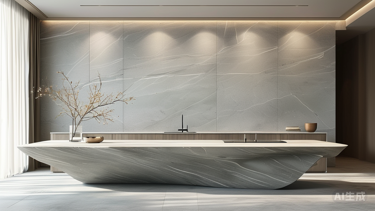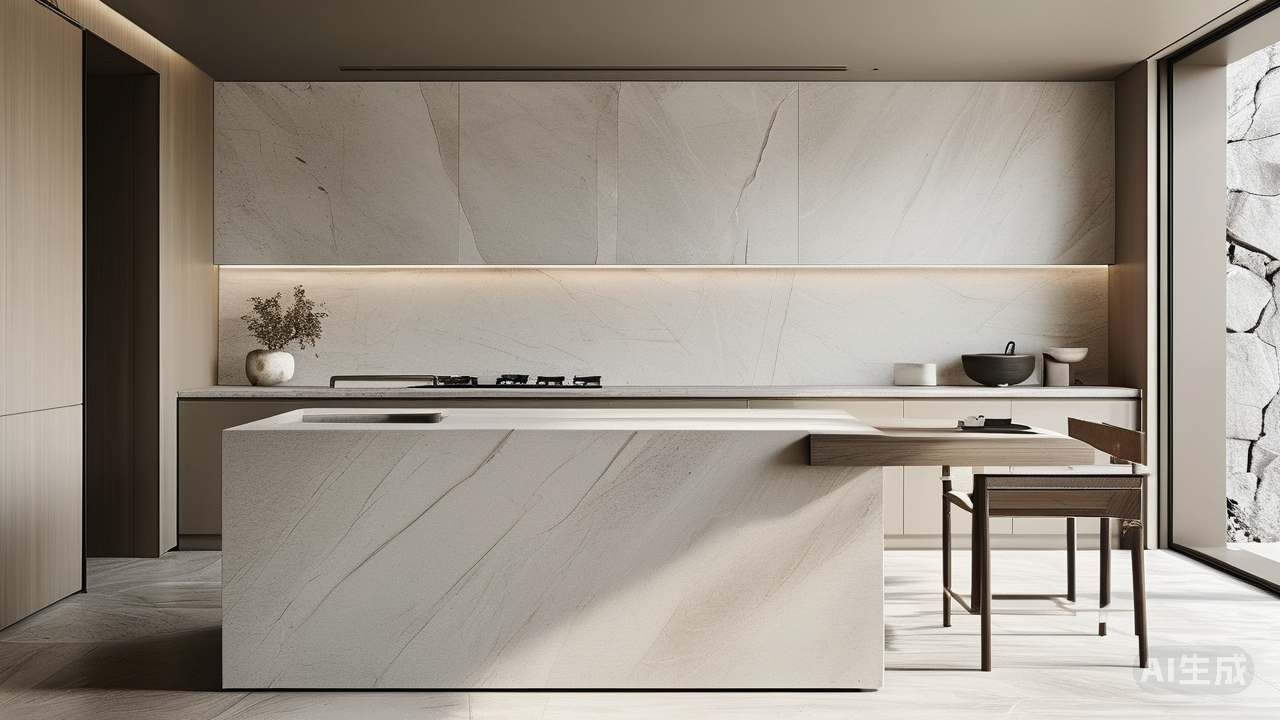 岩板新定义:用极简线条,勾勒现代轻奢美宅当设计语言回归纯粹,“线”便成为空间最有力的叙述者。在当代美宅的塑造中,一种材质正以独特的姿态,悄然成为极简线条的完美载体——那便是岩板。它不再仅是坚固耐用的表面覆盖物,而是以近乎苛刻的精准与洁净,重新定义了现代轻奢的视觉边界与质感深度。 岩板本身的物理禀赋,恰是极简得以立足的基石。其大规格尺寸(可达3200x1600mm甚至更大)如同一张延展的画布,让设计师得以挥洒无拘束的线条语言。整面铺贴的岩板墙,宛如天工开物,一泻而下,彻底抹平了传统瓷砖的繁复拼缝——视线所及,唯余一片完整、纯粹的平面,将“少即是多”的哲学凝固成可触摸的实感。而其卓越的耐磨性与几乎为零的吸水率,更确保了这份极致简约不被时间磨损,历久弥新。